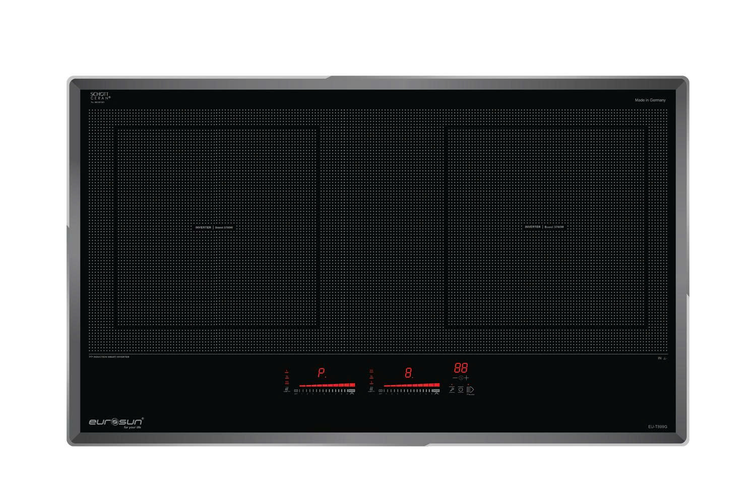 Điều đầu tiên khiến bếp từ đôi Eurosun EU‑T899G gây ấn tượng chính là mặt kính Schott Ceran cao cấp làm tại Đức. Chất liệu gốm thuỷ tinh có khả năng chịu lực va đập và chống sốc nhiệt tới 1 000 °C; bốn cạnh được vát nhẹ và bao quanh bởi viền hợp kim nhôm giúp hạn chế sứt mẻ trong quá trình sử dụng.. Bề mặt được in họa tiết chấm bi dạng lưới vừa đẹp mắt, vừa chống trượt nồi và chống xước.. Tấm thân vỏ bằng thép chống rỉ giúp bếp thích hợp với khí hậu nhiệt đới gió mùa và hạn chế rò rỉ điện..