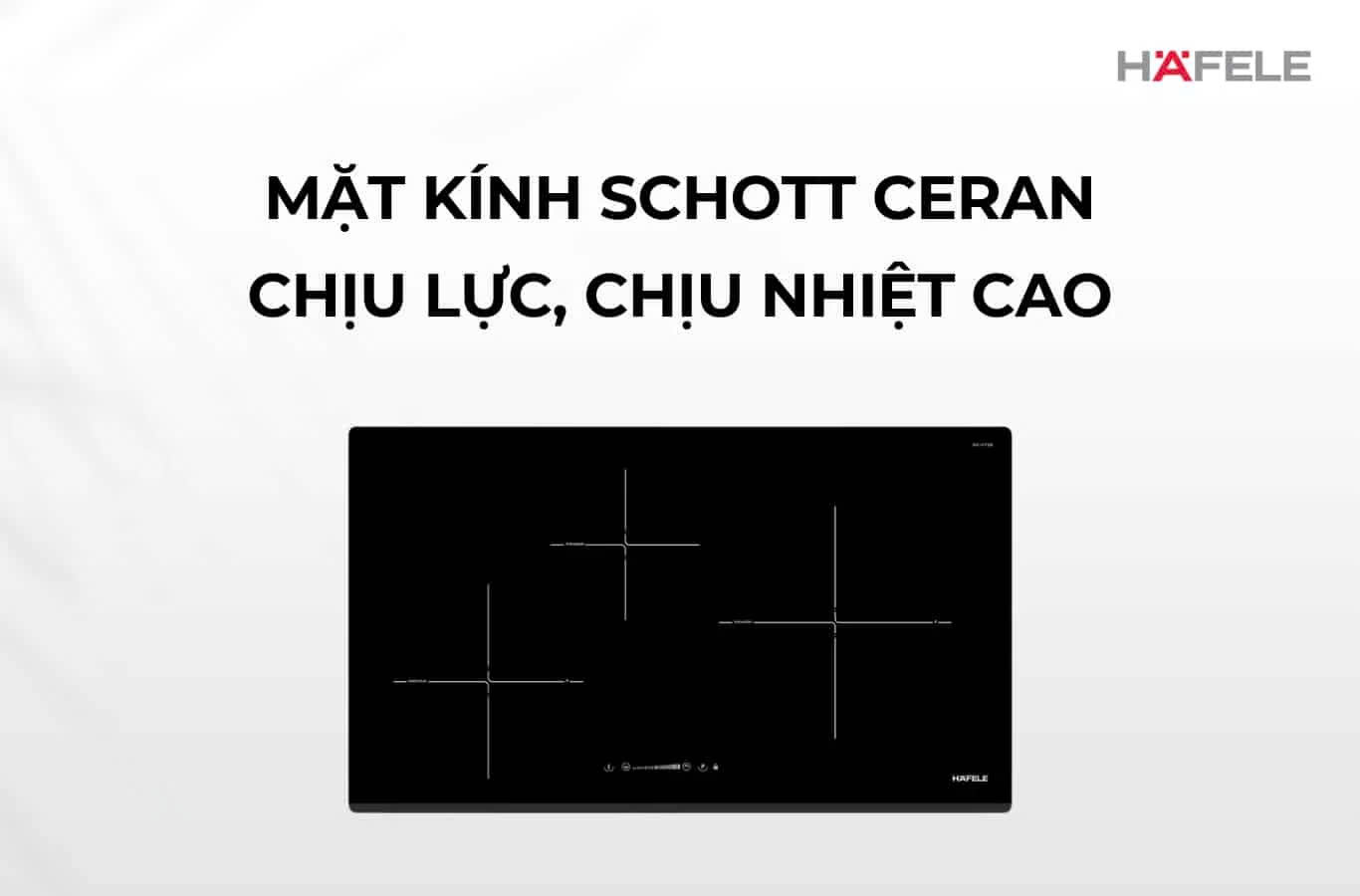 Mặt kính Schott Ceran®: Toàn bộ mặt bếp được làm từ kính gốm thủy tinh Schott Ceran cao cấp nhập khẩu từ Đức. Chất liệu này nổi tiếng chịu lực, chịu sốc nhiệt lên đến 1000 °C và chống trầy xước, vừa dễ vệ sinh vừa giữ được vẻ sáng bóng lâu dài.