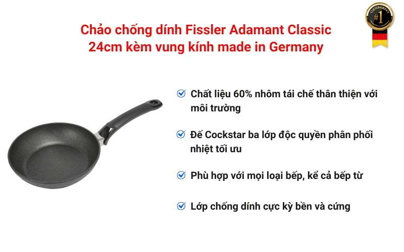 Nhờ đáy dày và lớp phủ bền bỉ, chảo có khả năng chịu nhiệt cao, cho phép áp chảo hoặc chiên rán ở nhiệt độ lớn mà không lo biến dạng. Công nghệ CookStar® giúp hạn chế tiêu hao năng lượng và giữ nhiệt ổn định. Fissler cung cấp bảo hành 5 năm và sản xuất chảo hoàn toàn tại Đức, đảm bảo độ bền và chất lượng vượt trội.