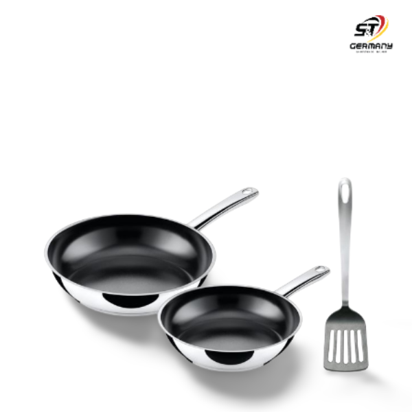 Bộ sản phẩm gồm hai chảo chống dính đường kính 20 cm và 24 cm kèm theo xẻng lật dài 31 cm. Đặc điểm dễ nhận thấy là lòng chảo sâu hơn so với chảo rán truyền thống, giúp hạn chế bắn dầu mỡ và xoay trở thực phẩm thoải mái. Đây là bộ chảo phù hợp cho gia đình nhỏ hay những bữa ăn nhanh khi nấu các món chiên xào, trứng, pancake, áp chảo thịt cá hoặc hâm nóng thức ăn.