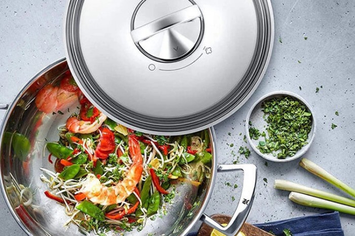 Với kiểu dáng wok hiện đại, chảo sâu lòng WMF không chỉ mang lại sự tiện dụng mà còn góp phần tạo điểm nhấn thẩm mỹ cho gian bếp. Bề mặt inox bạc sáng bóng kết hợp hai quai cầm bằng thép không gỉ tạo cảm giác sang trọng, chắc chắn.