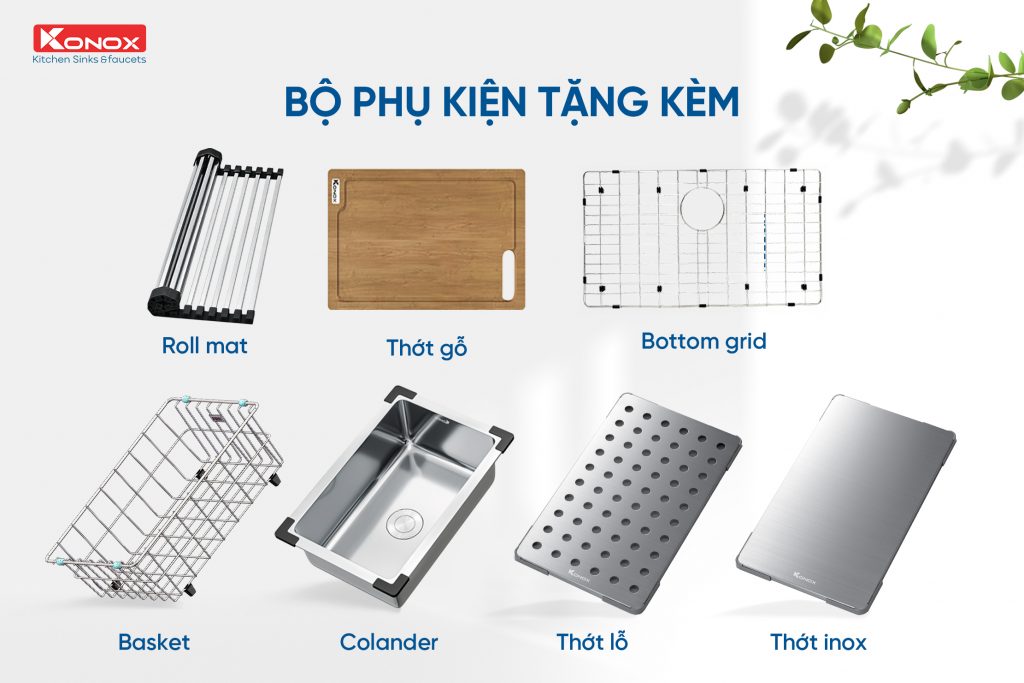 Bộ sưu tập phụ kiện chậu rửa bát Workstation Sink của Konox bao gồm nhiều lựa chọn như thớt gỗ, thớt inox, thớt lỗ inox, colander, giá úp bát, lưới đáy chậu, và thanh Rollmat. Mỗi phụ kiện đều được thiết kế với chất liệu cao cấp và tính năng đặc biệt, hỗ trợ tối đa cho công việc bếp núc, giúp bạn tiết kiệm thời gian và tận hưởng những khoảnh khắc đáng nhớ bên gia đình.