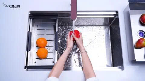 Để biến khu vực rửa bát thành “trạm sơ chế”, Artinox NA885U đi kèm bộ phụ kiện tùy chọn gồm thớt gỗ, rổ inox và khay đa năng. Những phụ kiện này được thiết kế vừa khít với gờ hạ bậc, có thể trượt qua lại dễ dàng. Nhờ đó, bạn có thể thái rau củ trên thớt, rửa rau trong rổ và để ráo ngay trên mặt chậu mà không chiếm thêm diện tích bếp.