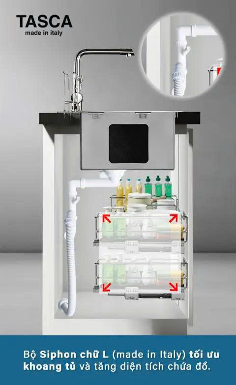 - Hệ thống siphon nhập khẩu từ Italy có cơ chế ngăn mùi và thoát nước nhanh. Nhờ đó, bếp luôn thơm sạch và hạn chế tình trạng ứ đọng nước.