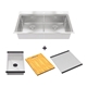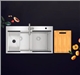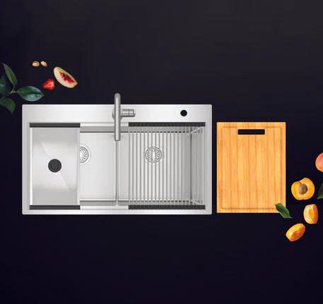 - Tối ưu không gian: Bộ phụ kiện đi kèm giúp biến bồn rửa thành khu vực sơ chế tiện lợi – thớt gỗ dùng để cắt gọt, lưới cuộn dùng để ráo nước, chậu nhỏ dùng để rửa riêng thực phẩm.
