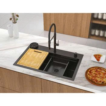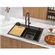 Chậu được thiết kế gờ hạ bậc giúp trượt các phụ kiện dễ dàng. Bộ phụ kiện gồm chậu rửa nhỏ phù hợp rửa rau củ, thớt gỗ chất lượng cao và rollmat bằng thép không gỉ để úp ly tách hoặc làm giá để nồi. Ngoài ra, chậu còn khay kim loại chịu nhiệt để đựng trái cây hoặc thực phẩm sau khi sơ chế.