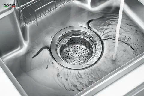 Nobinox trang bị cho NH905 bát rác đường kính 114 mm cùng hệ thống lọc rác ba lớp. Cấu trúc này gồm nắp đậy nhựa PP giữ nước, khay lọc thô giữ lại mẩu thức ăn lớn và lớp lọc tinh bằng inox với lỗ lọc chỉ 1 mm, ngăn cặn bẩn nhỏ lọt xuống ống thoát. Nhờ đó, nước thoát nhanh hơn, hạn chế tắc nghẽn và ngăn mùi hôi khó chịu. Đây là giải pháp toàn diện giúp bồn rửa luôn sạch sẽ, đường ống thông suốt.