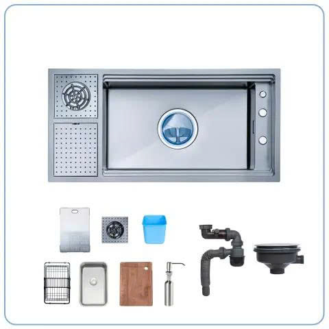- Tích hợp rửa cốc, hố rác mini, rổ lọc kéo, thớt gỗ, đáp ứng mọi thao tác bếp.
