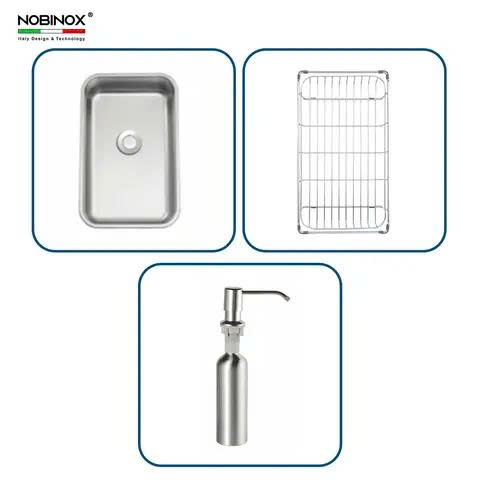 - Bộ phụ kiện đồng bộ: Khi mua chậu rửa bát Nobinox Lumia NJ557, bạn nhận được khay lọc rác, rổ rửa và bình đựng nước rửa bát. Những phụ kiện này được thiết kế đồng bộ, giúp việc sơ chế, rửa rau củ hoặc úp bát đĩa gọn gàng ngay trên chậu.