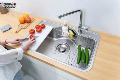 Khi mua Nobinox Rosa NN975D, bạn nhận được bộ phụ kiện đầy đủ gồm thớt nhựa và rổ inox. Thớt nhựa cho phép sơ chế thực phẩm ngay trên bồn rửa mà không làm hỏng bề mặt chậu, trong khi rổ inox giúp úp bát đĩa hoặc để rau củ ráo nước. Với combo này, mọi thao tác trong bếp diễn ra ngay tại chậu, giúp không gian luôn gọn gàng, khô ráo.