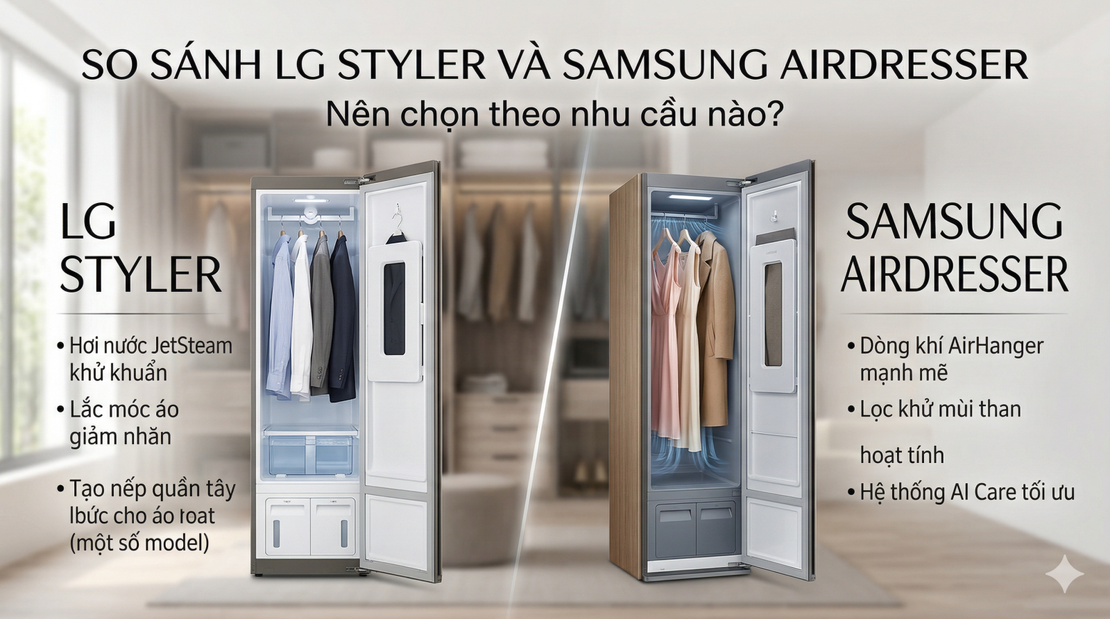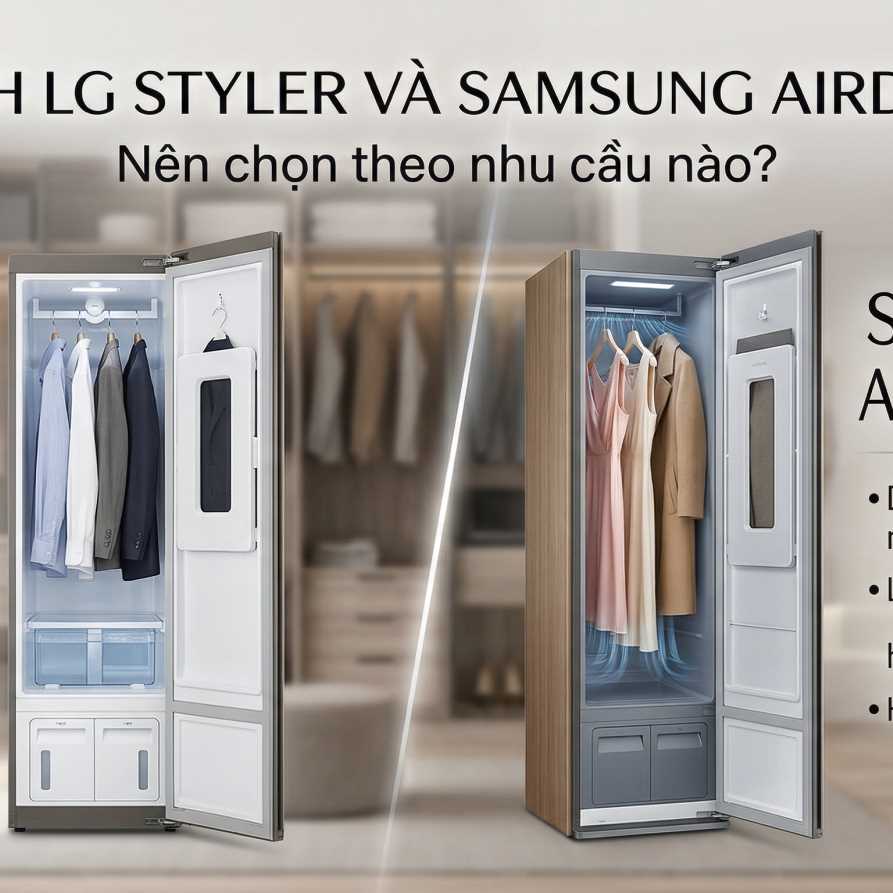 LG Styler và Samsung AirDresser đều làm mới quần áo bằng hơi nước và luồng khí, giúp khử mùi, giảm nhăn và sấy nhẹ. Chọn theo thói quen sử dụng: sức chứa, chương trình chăm sóc vải, độ ồn khi dùng ban đêm, công nghệ khử mùi và hệ sinh thái thông minh (SmartThinQ hoặc SmartThings).