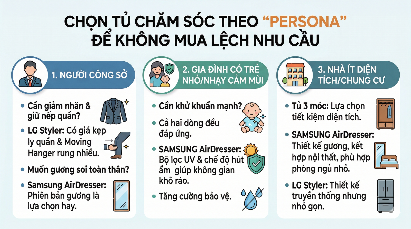 LG Styler nhấn mạnh TrueSteam, Moving Hanger và giá kẹp ly quần, trong khi Samsung AirDresser có Dual JetSteam, bộ lọc khử mùi UV và khả năng hút ẩm phòng ở một số model. - Nên chọn loại nào cho gia đình có trẻ nhỏ?