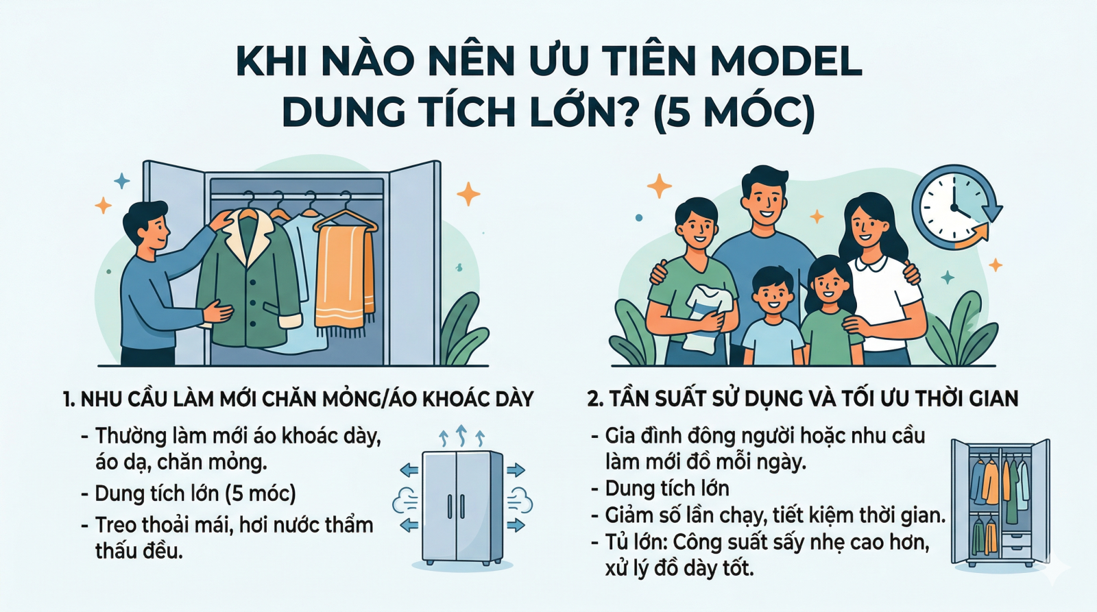 Gia đình đông người hoặc có nhu cầu làm mới đồ mỗi ngày nên chọn tủ dung tích lớn để giảm số lần chạy và tiết kiệm thời gian. Tủ lớn cũng có công suất sấy nhẹ cao hơn, giúp xử lý tốt đồ dày.