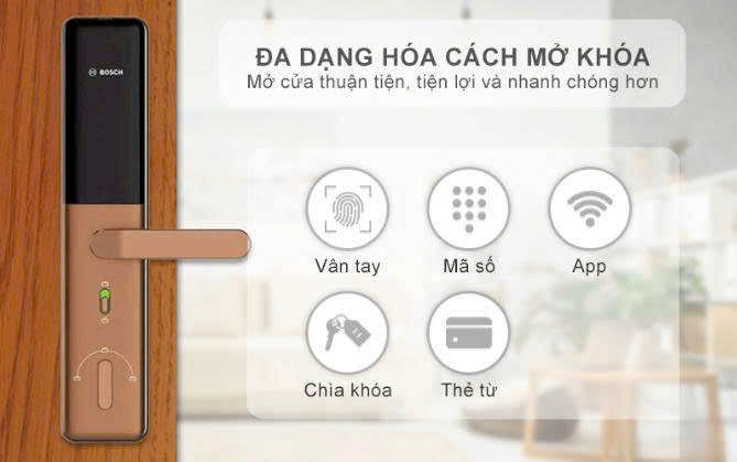 Vân tay, mật mã, thẻ từ, chìa cơ, điều khiển qua app |