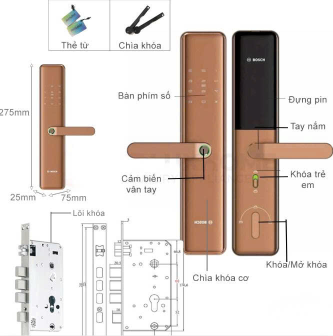 | Phụ kiện kèm theo | Thân ngoài + thân trong, mortise, 2 thẻ từ, 2 chìa cơ, vít/đế lắp, HDSD |