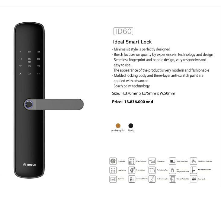 | Thông số kỹ thuật – Khóa điện tử BOSCH ID60 AMBER GOLD IDEAL SMART LOCK | |