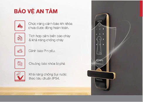 - An ninh đa lớp: Có chế độ khóa riêng tư, tự động khóa khi cửa đóng, cảnh báo khi bị phá khóa hoặc nhập sai mật khẩu nhiều lần.