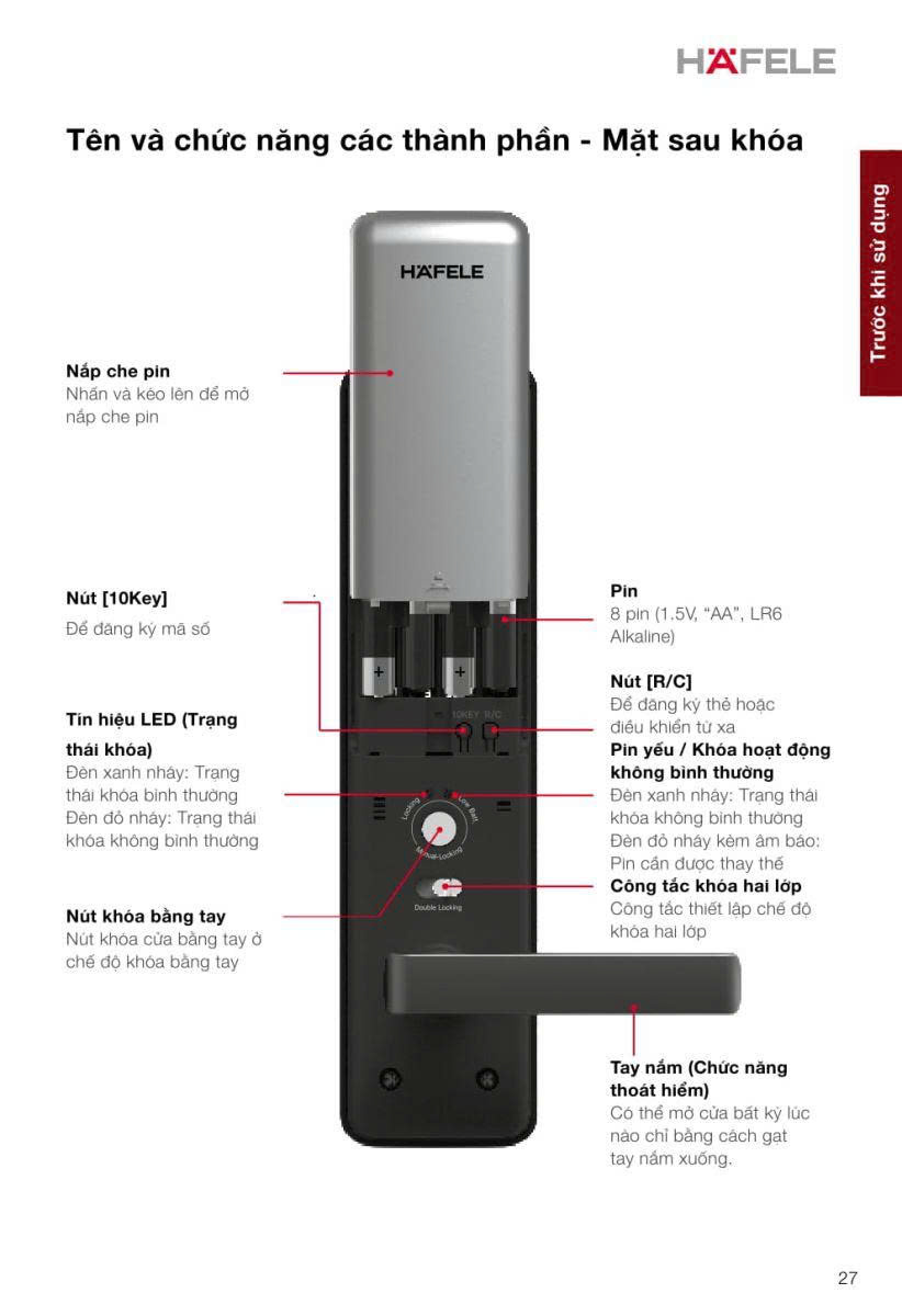 | Thông số kỹ thuật – Khóa điện tử Hafele EL8000 (Không bao gồm Pin) | |