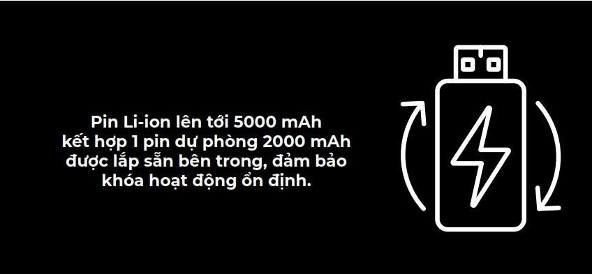 | Nguồn điện | 2 pin Li-ion: 1 pin chính 5000 mAh + 1 pin phụ 2000 mAh |