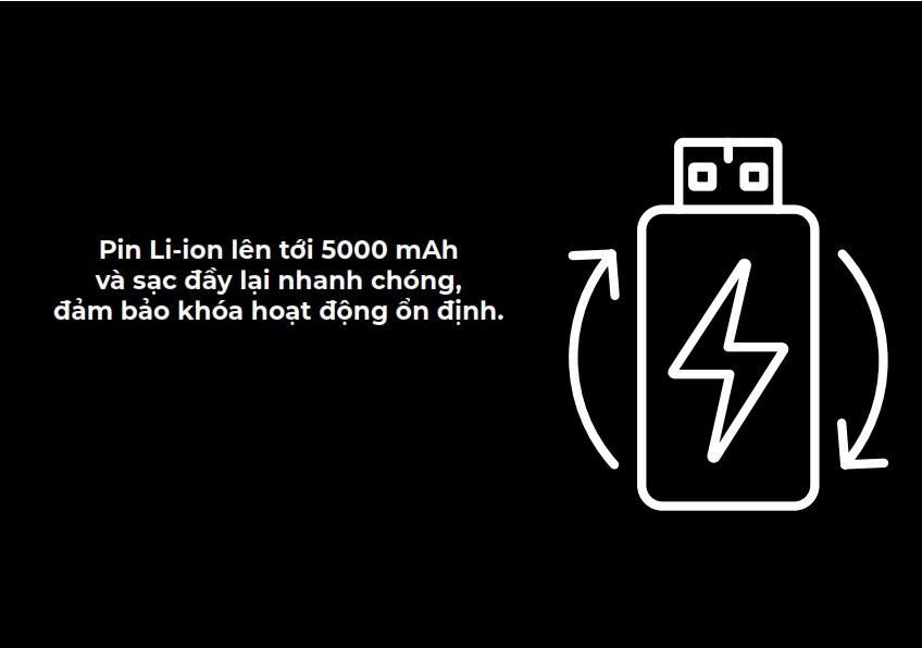 Khóa sử dụng pin Li‑Ion dung lượng 5 000 mAh, cho thời gian hoạt động bền bỉ. Công nghệ sạc nhanh qua cổng USB‑C giúp bạn nạp lại năng lượng nhanh chóng khi cần. Bộ pin có thể duy trì hoạt động trong nhiều tháng; khi gần hết pin, ứng dụng sẽ cảnh báo để bạn kịp thời sạc lại. Ngoài ra, cổng USB‑C cũng đóng vai trò nguồn khẩn cấp, đảm bảo khóa hoạt động ngay cả khi pin cạn.