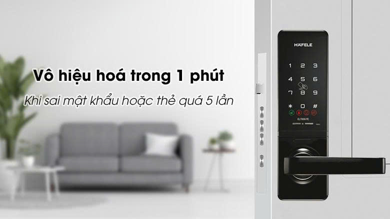 - Tự động vô hiệu hóa khi nhập sai: Nếu nhập sai mật khẩu hoặc dùng thẻ không đúng quá 5 lần liên tiếp, khóa sẽ vô hiệu hóa trong 1 phút; điều này hạn chế nguy cơ bị dò mã bằng các thiết bị phá khóa.