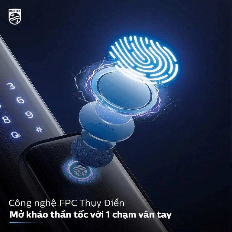Điểm nhấn của Philips DDL603E là cảm biến vân tay FPC đặt ngay trên tay cầm. Công nghệ FPC bán dẫn đến từ Thụy Điển đọc đồng thời ba yếu tố (nhiệt độ, áp suất và điện dung), quét 360 độ và nhận diện chưa tới 0,5 giây. Nhờ đó, việc mở cửa bằng vân tay diễn ra gần như tức thì. AI được tích hợp giúp tái tạo các dấu vân tay mờ, đảm bảo độ chính xác cao ngay cả khi ngón tay ướt hoặc lão hóa. Sự kết hợp này mang lại khả năng bảo mật vượt trội so với các cảm biến quang học thông thường.