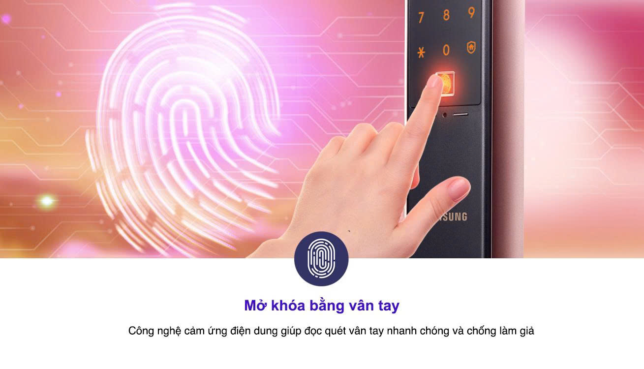 - Vân tay: Cảm biến vân tay dung điện dung nhận diện nhanh và chính xác. Người dùng chỉ cần đăng ký vân tay một lần, sau đó mở cửa dễ dàng bằng cách chạm. Khóa lưu trữ tới 100 dấu vân tay và 100 mã số, trong đó có 1 mã chủ quản lý.