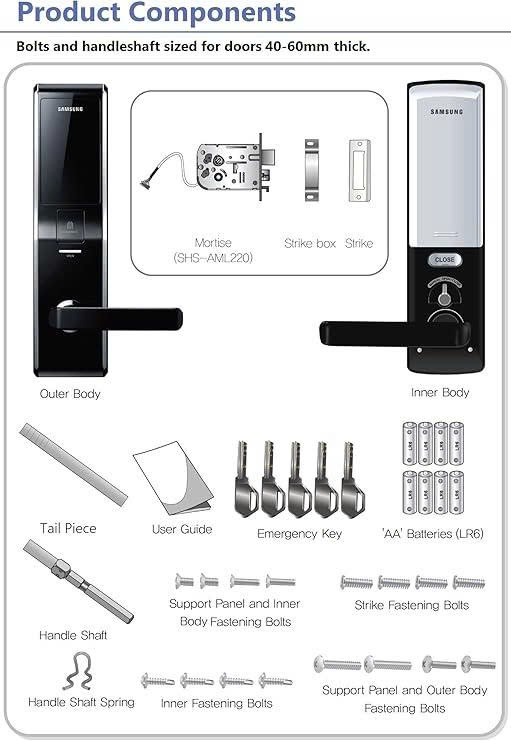 Cấu tạo mortise giúp lắp đặt chắc chắn, phù hợp với cửa dày 40 – 80 mm. Khoảng hở từ cạnh cửa tới khung tối thiểu 90 mm để đảm bảo tay nắm hoạt động mượt mà. Người dùng nên sử dụng pin alkaline và thay mới định kỳ 6 tháng để tránh rò rỉ.