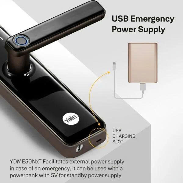 Yale YDME 50 NXT sử dụng bốn viên pin AA với thời lượng khoảng một năm hoặc 10.000 lần mở khóa. Khi pin cạn, người dùng có thể cấp nguồn tạm thời qua cổng USB 5 V để mở cửa. Tính năng này bảo đảm khóa luôn hoạt động ngay cả khi chưa kịp thay pin mới.