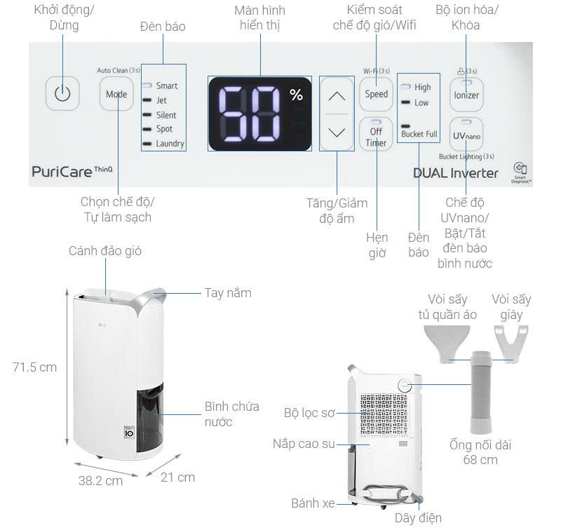Chế độ Smart (hút ẩm thông minh): duy trì độ ẩm cài đặt, tự điều chỉnh tốc độ quạt; sau khi đạt mức ẩm, máy tự ngắt và quạt tiếp tục chạy 10 phút để hong khô dàn lạnh.