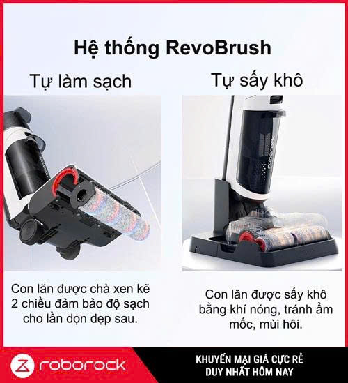 Thiết bị này kết hợp khả năng hút bụi mạnh mẽ với công nghệ lau và tự sấy khô, mang lại trải nghiệm một bước làm sạch. Roborock Dyad Air sử dụng cơ chế mopping ướt – nước sạch được phun xuống và lăn trục cuốn lấy bụi bẩn, sau đó hút toàn bộ chất lỏng và rác thải vào bình nước bẩn.. Sau mỗi lần sử dụng, bạn đặt máy lên dock sạc, hệ thống RevoBrush™ sẽ tự động chà rửa con lăn và sấy khô bằng luồng khí nóng; tác dụng này giúp loại bỏ tới 99 % chất bẩn và ngăn mùi mốc..
