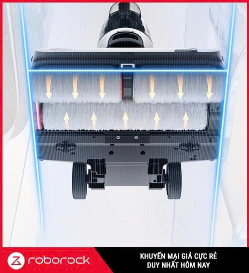 Máy được trang bị ba con lăn gồm một con lăn trước và hai con lăn sau xoay ngược chiều nhau, tạo nên hệ thống Dyad Power System. Cấu trúc này giúp chổi luôn nằm trên sàn và quét sạch hai mặt đồng thời roborocks.vn, tránh sót lại vết bẩn. Khi kết hợp với lực hút 17 000 Pa, robot vừa hút sạch bụi, vừa lau ướt bằng nước sạch liên tục để vết bẩn tan ra nhanh chóng.