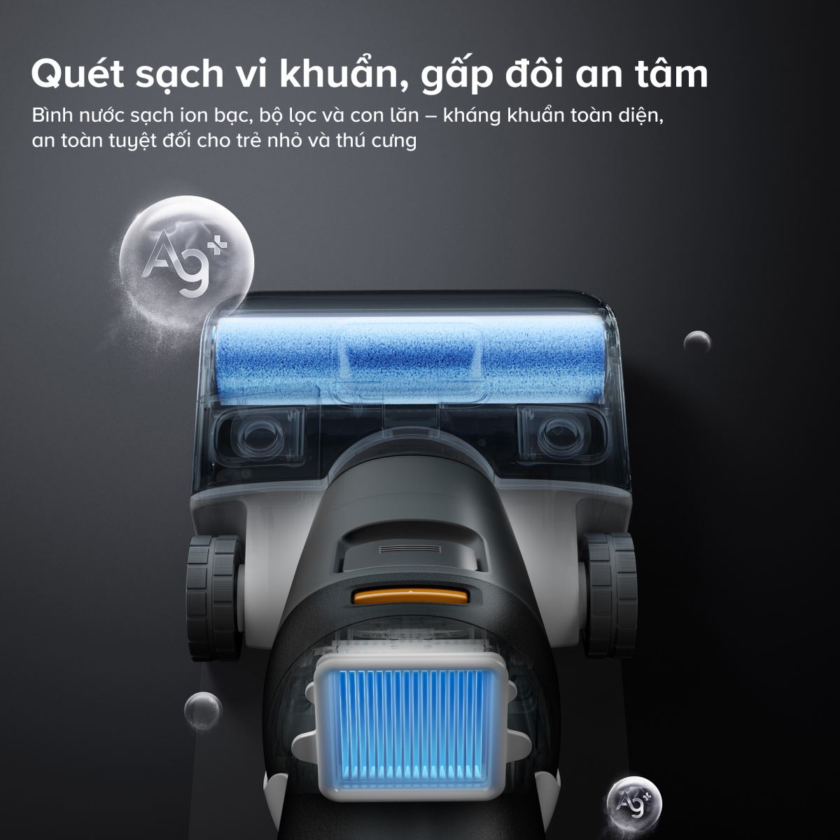 - Thiết kế bình nước đặt thấp tăng áp lực con lăn lên sàn thêm khoảng 20 N để đánh bay vết bẩn cứng đầu.