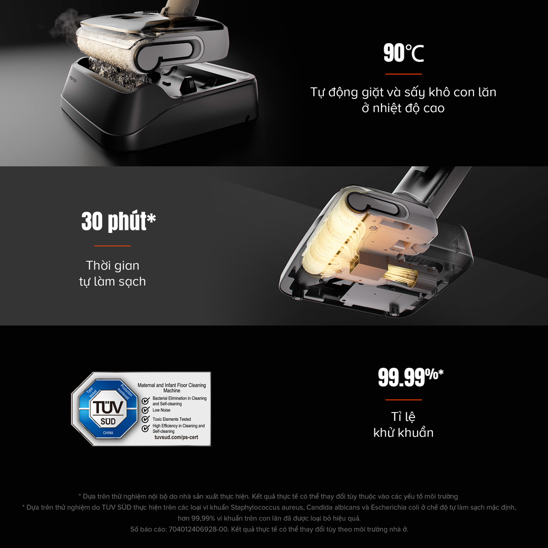 - Tự làm sạch & sấy nóng 90°C – Con lăn được rửa sạch bằng nước nóng và sấy khô tự động, ngăn nấm mốc, khử mùi, luôn sẵn sàng cho lần sử dụng tiếp theo.