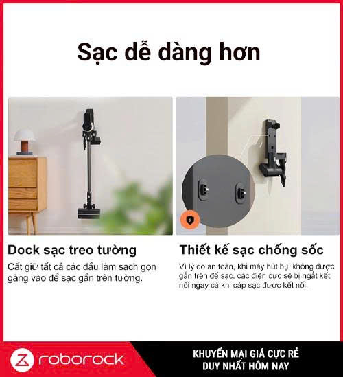 Dung lượng pin lớn giúp Roborock H5 vận hành liên tục tối đa 60 phút mỗi lần sạc. – đủ để làm sạch một căn hộ hoặc nhà nhỏ mà không lo gián đoạn. Theo đánh giá thực tế, thời gian này có thể thay đổi tùy chế độ hút: chế độ mạnh sẽ tiêu thụ nhiều năng lượng hơn, nhưng vẫn đủ để xử lý các khu vực bẩn nhất. Khi cần sạc, bạn chỉ cần đặt máy lên đế treo tường; đế này vừa là nơi cất giữ gọn gàng, vừa là bộ sạc an toàn.. Thiết kế chống sốc điện giúp tránh rò rỉ khi không đặt máy lên dock, đảm bảo an toàn cho gia đình..