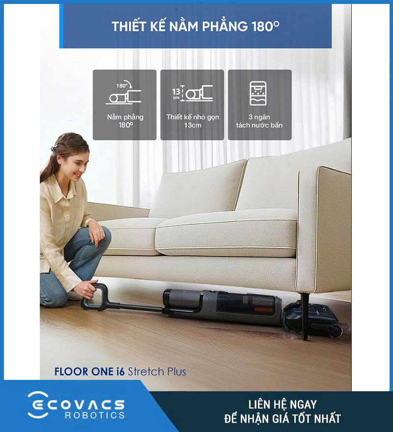Sẽ không còn những góc chết dưới ghế sofa hoặc gầm tủ. Floor One I6 stretch Plus có thể ngả phẳng 180°, chiều cao lúc nằm phẳng chỉ 13 cm... Nhờ thiết kế này, máy dễ dàng luồn sâu vào các vị trí thấp, mang lại sàn nhà sạch từ trung tâm tới mép tường.