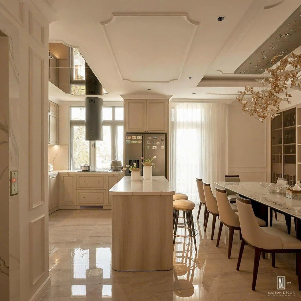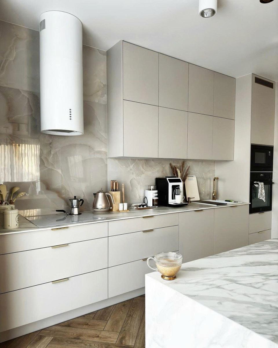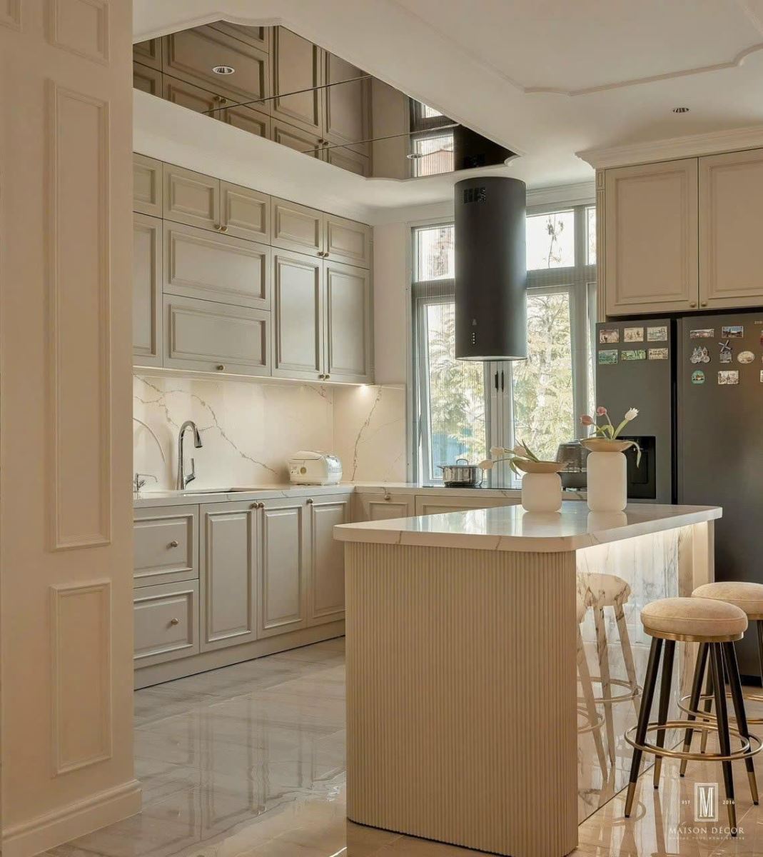 - Thiết kế ống trụ treo trần độc đáo – biến máy hút mùi thành điểm nhấn nghệ thuật trong căn bếp cao cấp.