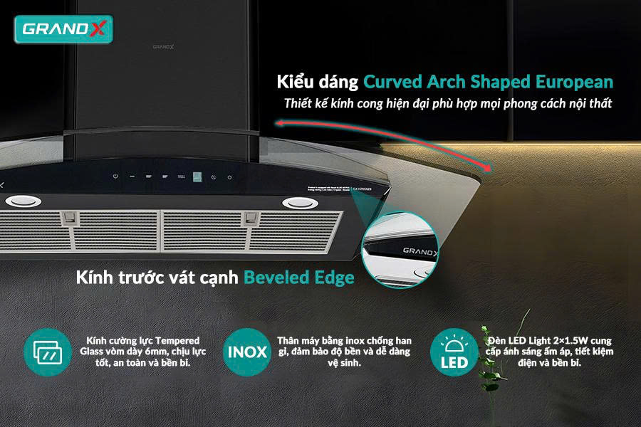 Máy hút mùi GrandX GX H90C62B kính cong 90cm hiện đại, hút mùi hiệu quả, vận hành êm ái, dễ sử dụng, phù hợp không gian bếp rộng gia đình