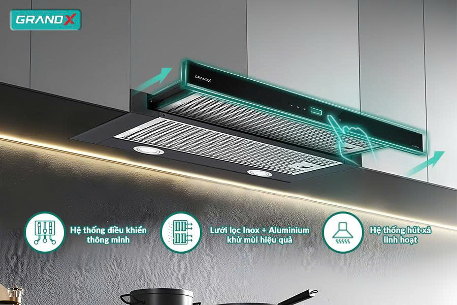Máy hút mùi GrandX GX H90F58B âm tủ Telescopic kéo trượt gọn gàng, hút mùi hiệu quả, vận hành êm ái, phù hợp mọi không gian bếp hiện đại
