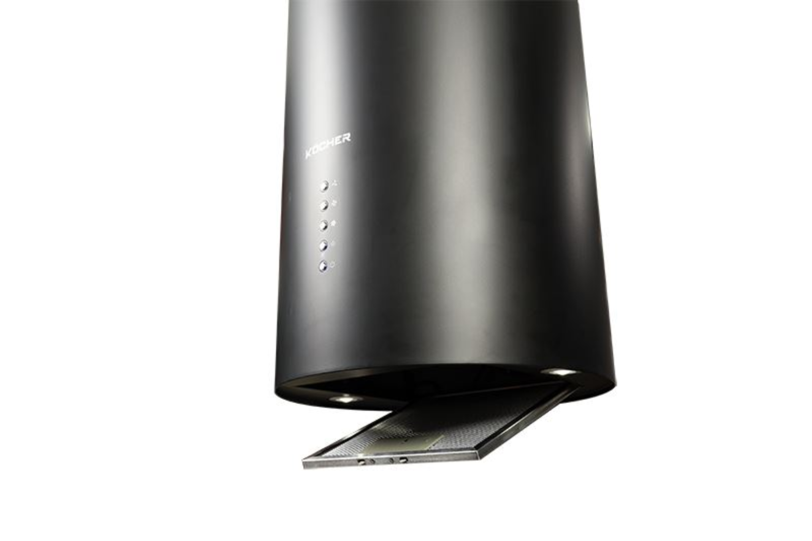 Máy hút mùi đảo Kocher Serena CXW-188BL có thiết kế dạng trụ tròn màu đen mờ tinh tế, như một điểm nhấn nội thất sang trọng trong căn bếp đảo.