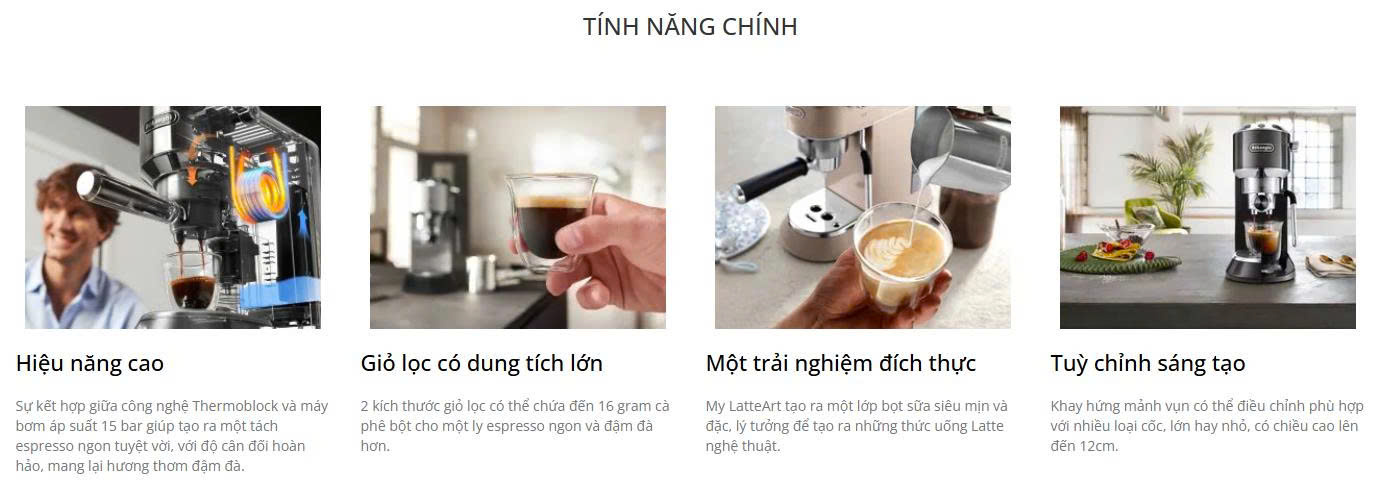 | Chức năng đồ uống | Espresso đơn, espresso đôi, đánh sữa cho cappuccino/latte |