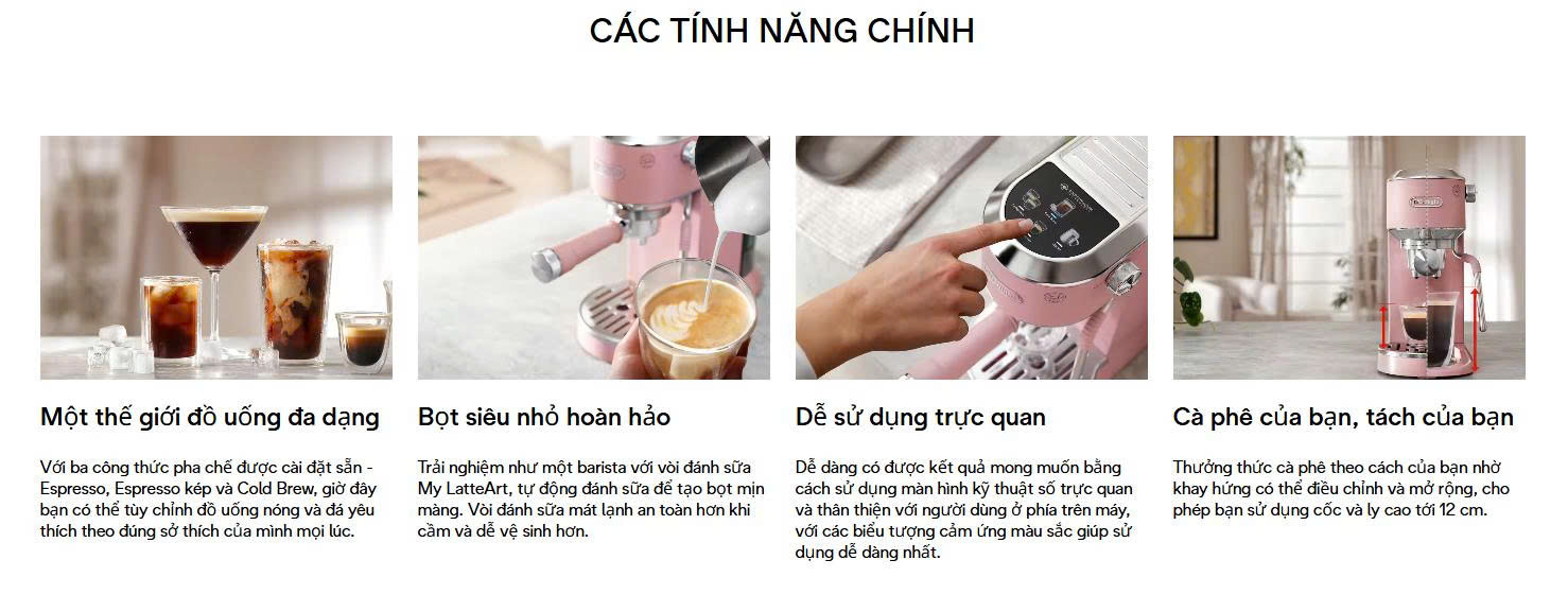 Delonghi Dedica Duo – Pink EC890.PK là sự kết hợp giữa thiết kế Ý đẳng cấp và công nghệ hiện đại. Máy mang lại khả năng pha espresso đậm đà và cold brew mát lạnh chỉ trong vài phút, nhờ công nghệ chiết xuất tiên tiến và bơm áp suất chuyên nghiệp. Màu hồng pastel cùng thiết kế mỏng gọn khiến máy trở thành điểm nhấn thẩm mỹ cho bất kỳ căn bếp nào. Màn hình cảm ứng trực quan, vòi đánh sữa My LatteArt và bộ phụ kiện đầy đủ giúp người dùng từ người mới đến người đam mê cà phê đều dễ dàng trở thành barista tại gia. Nếu bạn tìm kiếm một chiếc máy pha cà phê thủ công vừa đẹp mắt vừa đa năng, phiên bản Dedica Duo Pink sẽ là lựa chọn không thể bỏ qua.