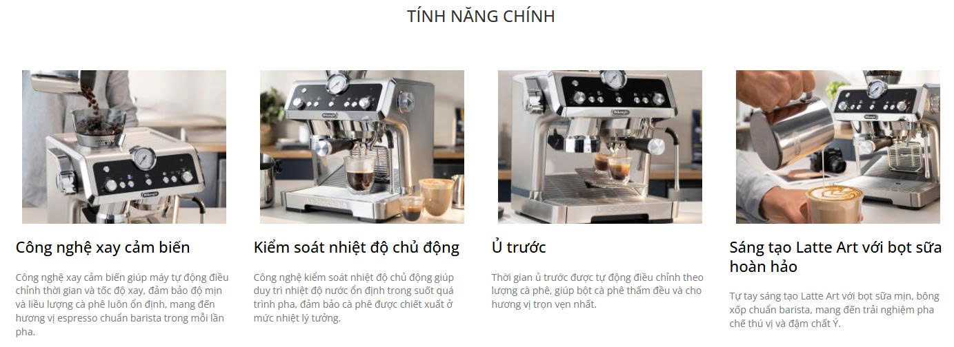 | Tính năng nổi bật | Công nghệ xay cảm biến (Sensor Grinding); Trạm nén Smart Tamping Station một chạm; Dynamic Pre-Infusion (tự điều chỉnh thời gian ủ); Hệ thống gia nhiệt kép Dual Thermoblock; Active Temperature Control với 3 mức nhiệt; Vòi hơi My Latte Art tạo bọt sữa microfoam; Bình nước, khay nước và khay nhỏ giọt có thể tháo rời. |