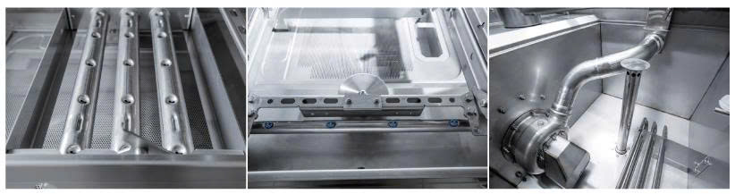 Máy đạt hiệu quả cao nhờ công nghệ phun nước áp suất cao kết hợp với các cánh tay phun inox bền bỉ. Nhiệt độ rửa giữ ở mức 55–65 °C và nhiệt độ tráng 80–90 °C giúp loại bỏ dầu mỡ và vi khuẩn, đồng thời khử mùi thức ăn. Người vận hành cũng có thể điều chỉnh áp suất nước đầu vào thông qua van, đảm bảo quá trình rửa ổn định.
