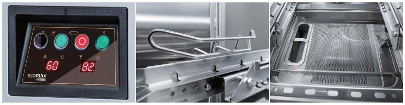 Điểm nổi bật của C800 là bảng điều khiển điện tử; người dùng có thể dễ dàng tùy chỉnh chương trình và theo dõi trạng thái hoạt động của máy. Thiết kế băng tải hai chiều cho phép chọn hướng đưa bát đĩa ra vào phù hợp với quy trình thao tác. Ngoài ra, máy có khả năng tích hợp với các bàn rửa trước và sau, giúp tạo thành dây chuyền rửa chén đồng bộ.