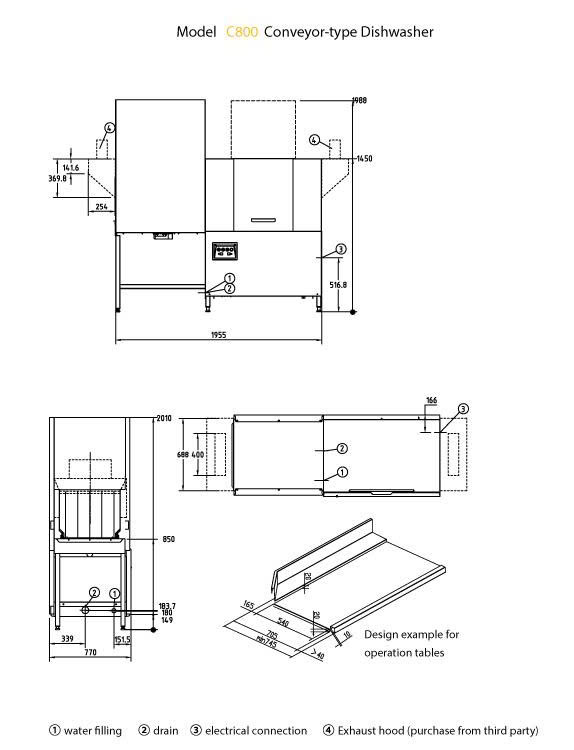 C800 có kiểu dáng băng chuyền, gồm hệ thống rửa từ trái qua phải hoặc ngược lại, giúp chủ động sắp xếp phù hợp với bố cục bếp. Vỏ máy được làm từ inox không gỉ, mang lại độ bền cao và dễ vệ sinh. Phần khoang rửa rộng với chiều cao tải 440 mm và giỏ kích thước 500 × 500 mm, phù hợp với nhiều loại bát đĩa và dụng cụ nấu lớn. Hệ thống lọc bằng thép không gỉ đặt trong bể rửa ngăn cặn bẩn vào bộ phận phun, giúp duy trì hiệu suất và kéo dài tuổi thọ máy.