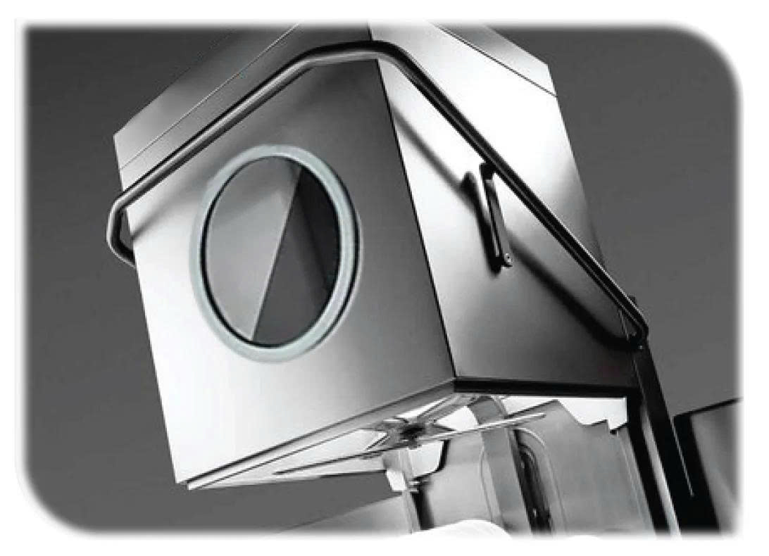 Kiểu dáng cửa sập giúp tiết kiệm diện tích, thuận tiện cho việc xếp khay vào và lấy ra ngay cả trong khu vực bếp hẹp. Kính cường lực trong suốt được gắn ở cửa giúp người dùng dễ dàng quan sát quá trình rửa bên trong. Cơ chế trợ lực đảm bảo việc mở – đóng nhẹ nhàng, và máy tự động dừng hoạt động khi cửa mở, bảo đảm an toàn cho người vận hành.