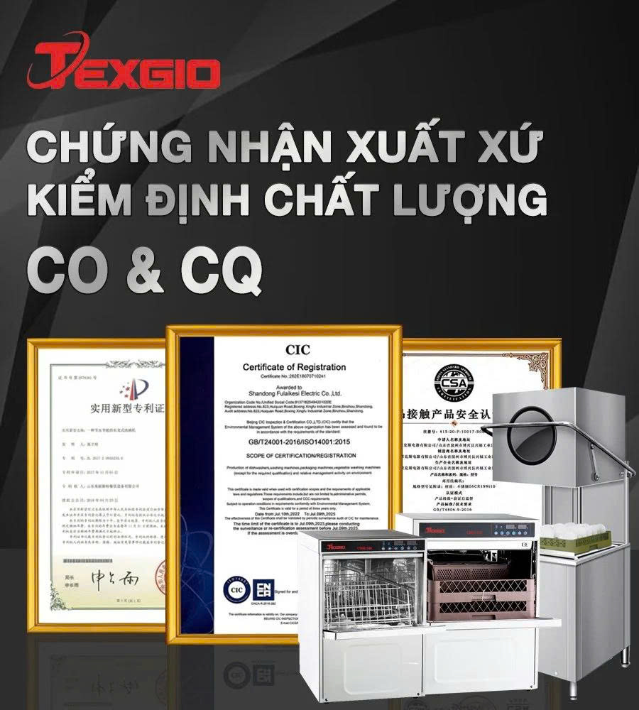 Texgio là thương hiệu được trao nhiều giải thưởng uy tín. Các dòng máy rửa bát công nghiệp Texgio đều có chứng nhận CO (Certificate of Origin) và CQ (Certificate of Quality) để khẳng định nguồn gốc và chất lượng. Từ năm 2021 đến 2023, máy rửa bát Texgio liên tục được vinh danh trong các giải thưởng thương hiệu vàng, nhãn hiệu uy tín, doanh nghiệp xuất sắc, chứng tỏ sự tin cậy của thị trường.
