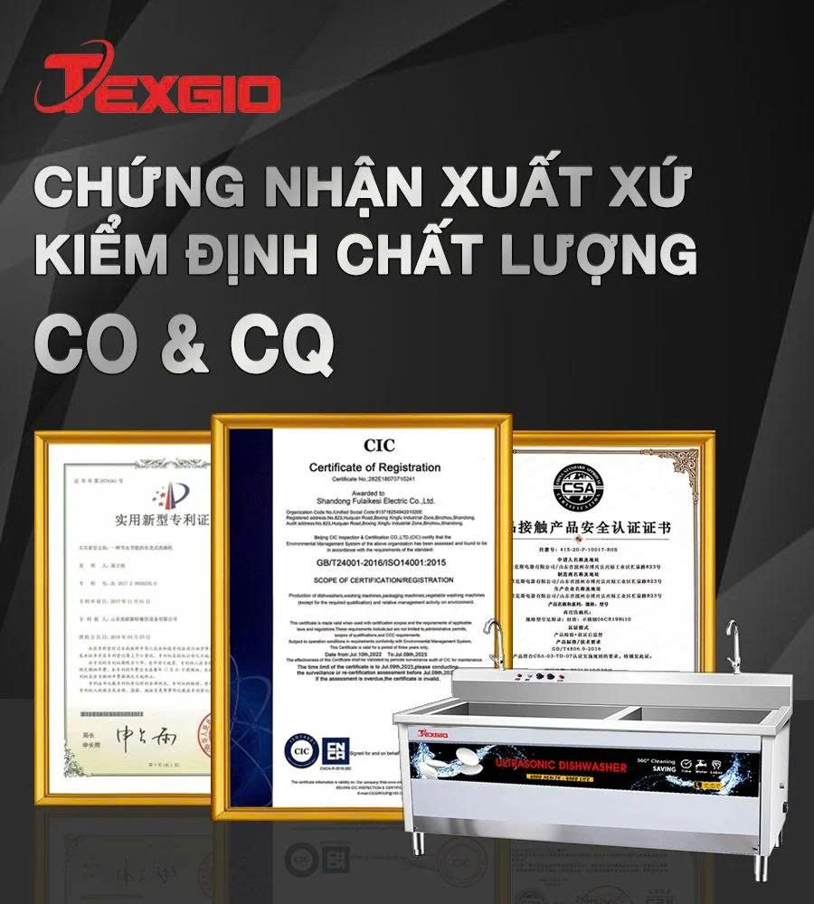 Texgio là thương hiệu chuyên về thiết bị nhà bếp công nghiệp đã nhận được giải thưởng Thương hiệu vàng 2021 và Top 10 Thương hiệu uy tín 2022 theo trang chủ hãng. Sản phẩm TGU‑800SS đạt chứng nhận CO, CQ chứng minh nguồn gốc xuất xứ và chất lượng đạt chuẩn. Việc sử dụng máy rửa bát của một thương hiệu uy tín giúp khách hàng yên tâm về độ bền và dịch vụ hậu mãi.