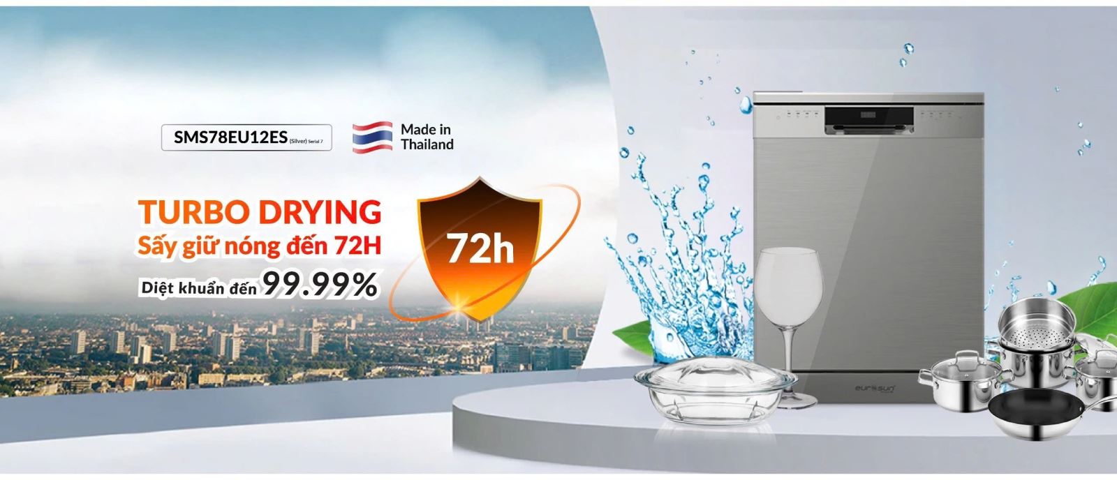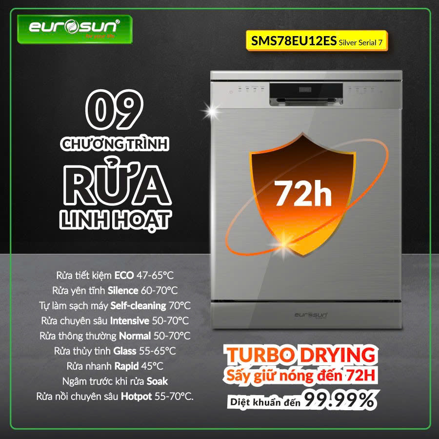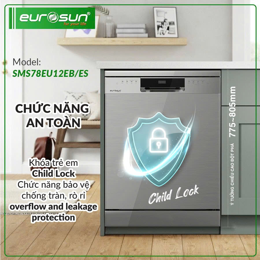 Máy rửa bát Eurosun SMS78EU12ES: Thiết kế sang trọng, công suất 14 bộ